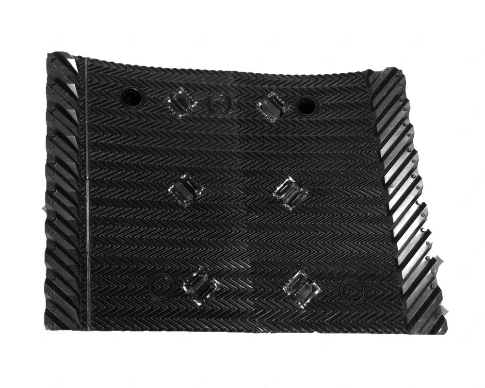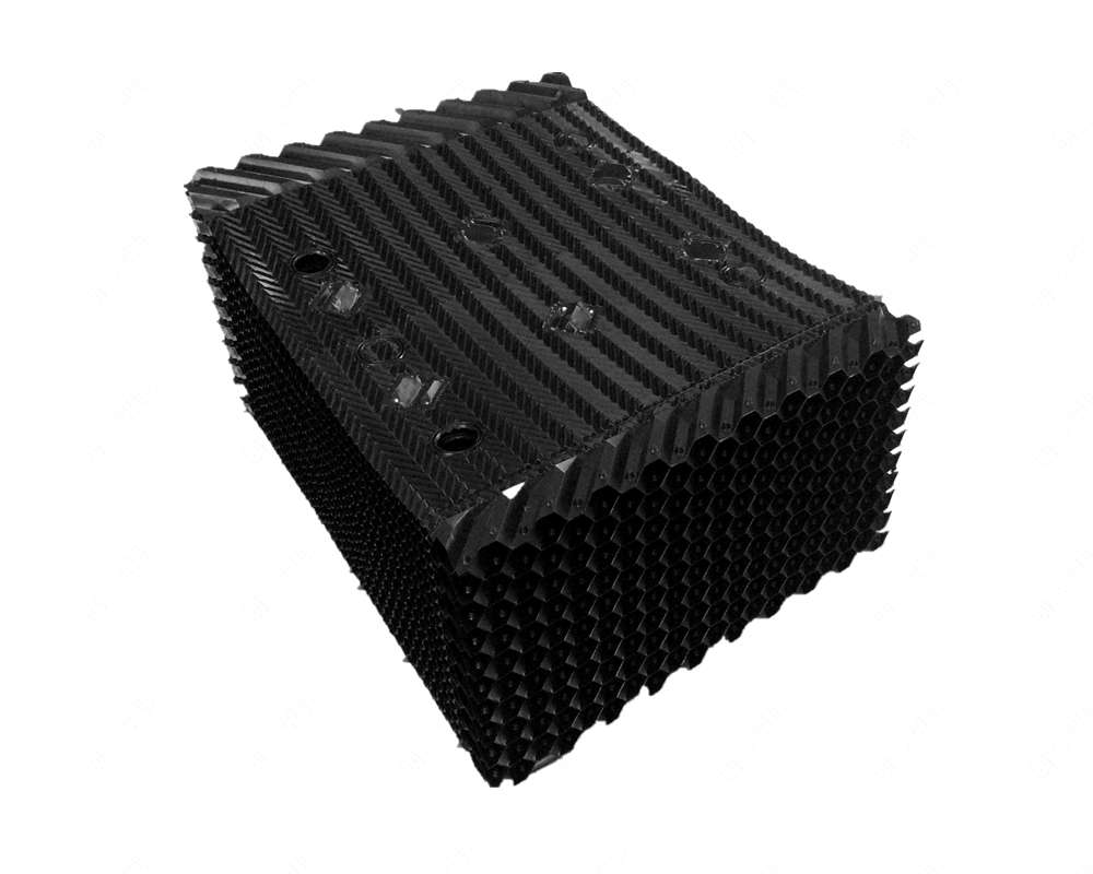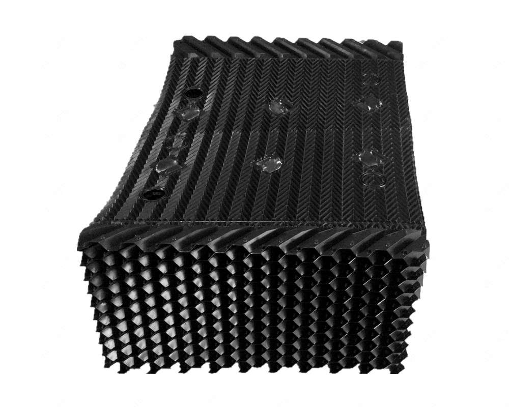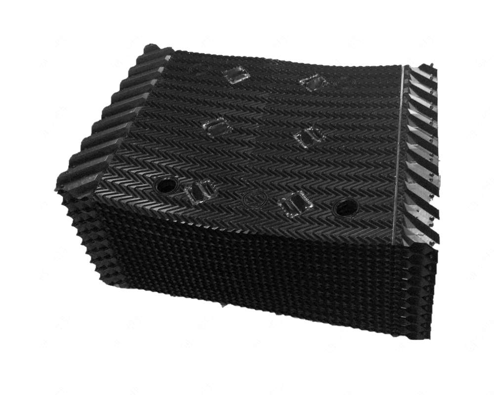 冷卻塔塔芯填料是由優(yōu)質(zhì)PVC聚乙烯片正負壓及吸塑而成,主要采用了水紋波形、梯形波、點波形、S波型、人字波形填料,散熱面積增長系數(shù)大,水流在板面上分布性能好,水和空氣流經(jīng)板面時擾動大等優(yōu)點。填料不易變形,耐高溫,抗老化,且阻燃性能好,風阻系數(shù)小。安裝方便,易清洗,運輸方便該散熱填料采用粘接式及懸掛式,安裝簡便,便于清洗,且成功解決了粘接填料因吸積垢、自重而產(chǎn)生變形,且變形后積垢更加嚴重、難于清洗的問題。填料阻燃性能好,阻燃氧指數(shù)指標為42.7,每立方米組裝體質(zhì)量約為15 kg—30kg/m3,組裝高度為0.5m—3.0m,交錯布置,對于塔壁周邊異形塊可視現(xiàn)場布置情況,按實際尺寸切割、安裝。
